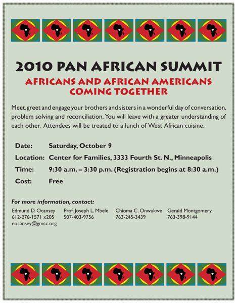 African & African-Americans Come Together Oct. 9 Posted on October 5, 2010October 5, 2010 by DeniseMpls View Flyer for Pan African Summit Share this: Click to share on X (Opens in new window) X Click to share on Facebook (Opens in new window) Facebook Click to share on LinkedIn (Opens in new window) LinkedIn Click to share on Pinterest (Opens in new window) Pinterest More Click to email a link to a friend (Opens in new window) Email Click to print (Opens in new window) Print Click to share on Reddit (Opens in new window) Reddit Click to share on Tumblr (Opens in new window) Tumblr Like Loading... Related